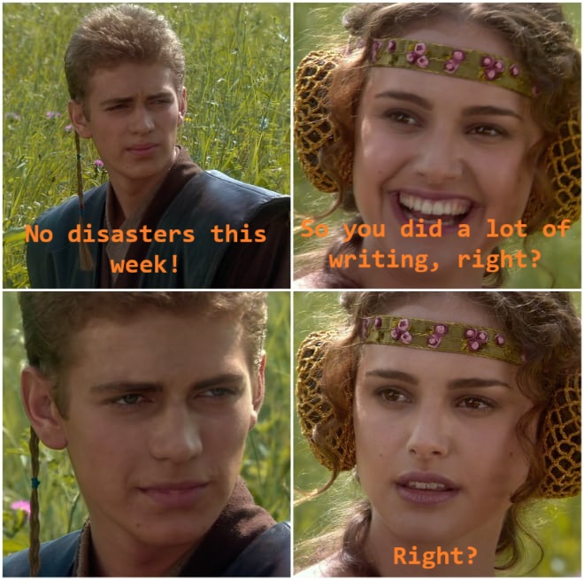 Work continued on the new chapter on Wednesday and during my lunch-hour on Thursday, but on Wednesday night, I’d had an idea I was excited about for my new blogpost, and I wanted to begin work on it, so chapter 0.2.1.11 took a backseat for Thursday evening and Friday while I outlined it and began writing. The format is a little different, which makes it a bit longer than some of my previous posts, so I needed an outline. If I can pull off what I’m aiming for, I think it’ll be good. Keep an eye out for it in the next week or two.