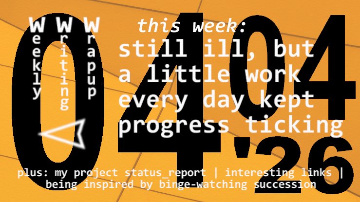 This week: still ill, but a little work every day kept progress ticking; the status of my current projects; The Spike-related links; and being inspired by binge-watching Succession.