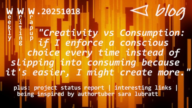 This week: creativity vs consumption, and starting draft 3 of The Spike Volume 2; the status of my current projects; The Spike-related links; and being inspired by AuthorTuber Sara Lubratt.