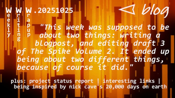 This week: editing draft 3 of The Spike Volume 2, and two new ideas I can't talk about; the status of my current projects; The Spike-related links; and being inspired by Nick Cave's "20,000 Days on Earth".