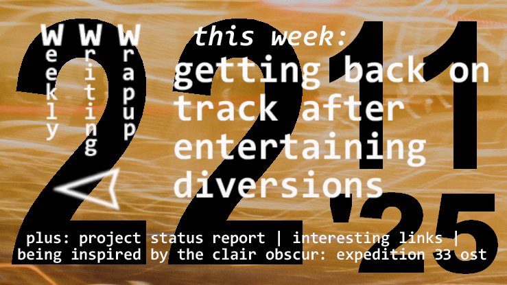 This week: getting back on track after entertaining diversions; the status of my current projects; The Spike-related links; and being inspired by the Clair Obscur: Expedition 33 OST (again).