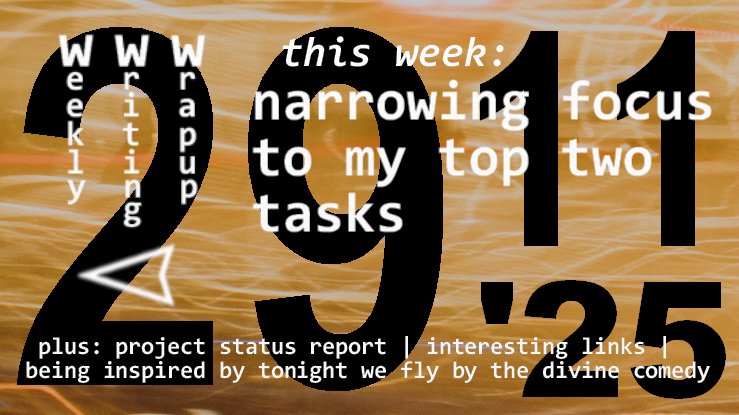 This week: narrowing focus to my top two tasks; the status of my current projects; The Spike-related links; and being inspired by Tonight We Fly by The Divine Comedy.
