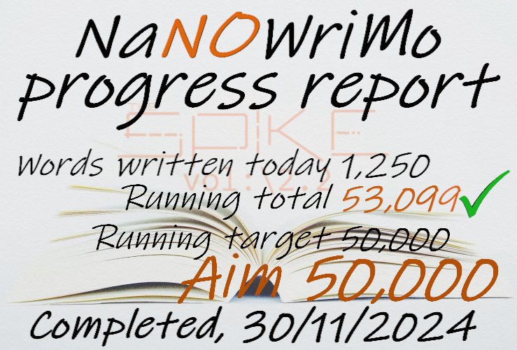 NaNOWriMo 2024 day 23 update – will I complete the challenge? (yes) 23/11/2024 arrowmakerbooksLeave a comment I hate clickbait titles. There's no jeopardy here.