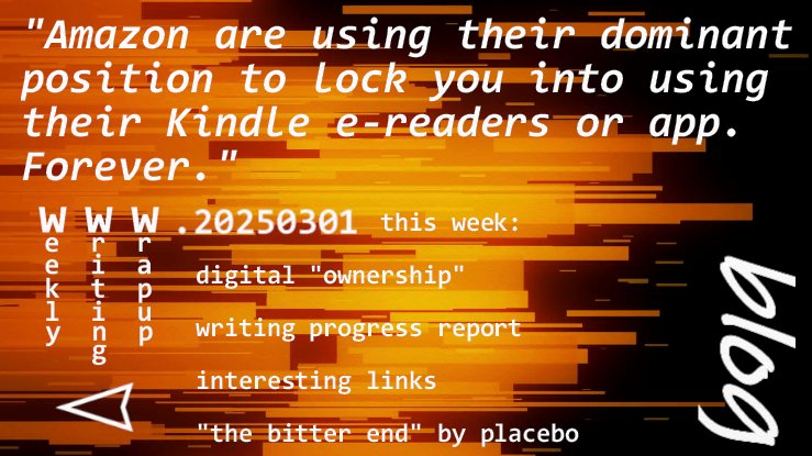 This week: digital "ownership" and my change of plans for selling my books; an update on my writing; The Spike-related links; and "The Bitter End" by Placebo.