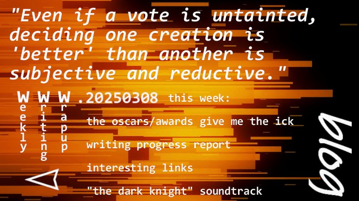 This week: the Oscars and why awards give me the ick; an update on my writing; The Spike-related links; and being inspired by The Dark Knight soundtrack.