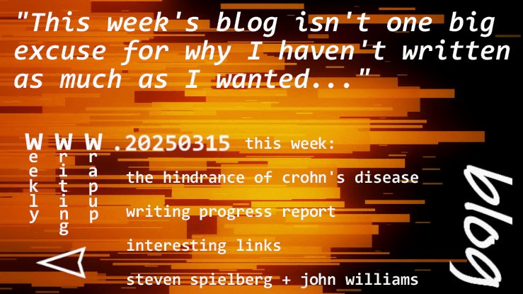 This week: the hindrance that is my Crohn's disease; an update on my writing; The Spike-related links; and the magic of seeing a dinosaur for the first time in Jurassic Park.