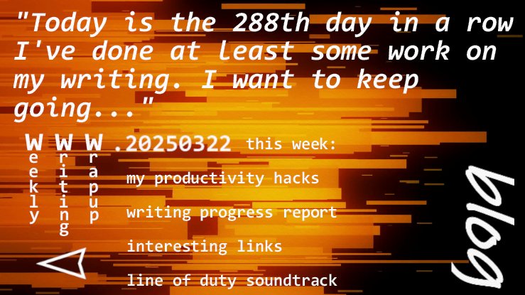WeeklyWritingWrapup.20250322 22/03/2025 arrowmakerbooksLeave a comment This week: my productivity hacks; an update on my writing; The Spike-related links; and being inspired by the Line of Duty soundtrack.